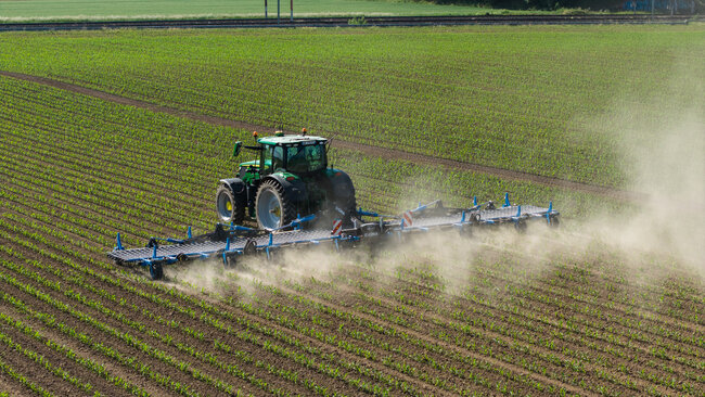 Herse étrille de précision sur 6 rangées. Réglage hydraulique de la pression des dents Ø7 mm de 500 gr à 5 Kg. Dents escamotables. Largeur de transport 3m. Signalisation.