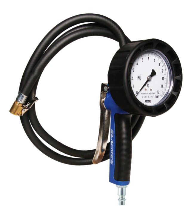 Pistolet de gonflage SUPER 0-12 bar - Flexible 1,5m Ø6x11mm, Poinçonné et homologué CE, Embout norme AFAQ, Gâchette 3 positions, Protection enrobante, Manomètre Ø80 mm, Echelle de graduation I-0,1bar, fourni avec un raccord rapide